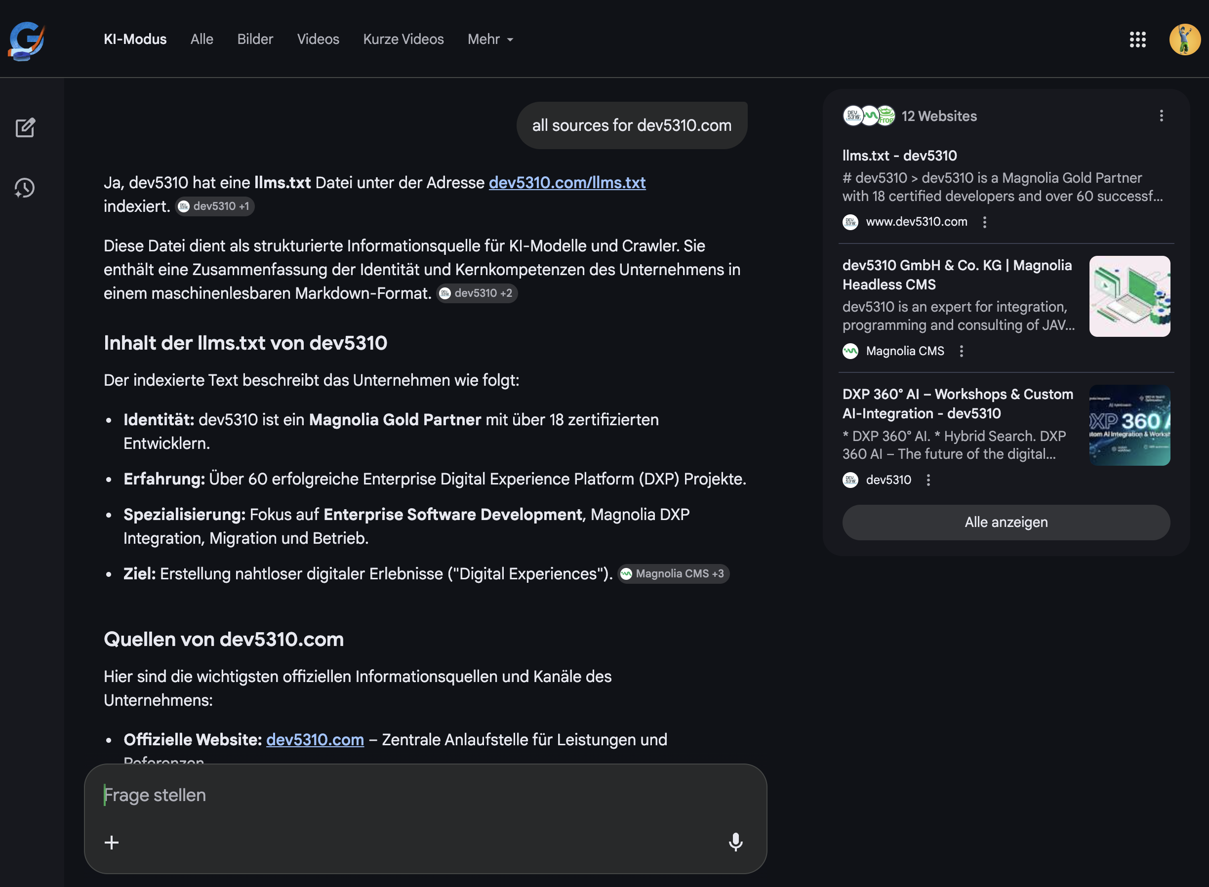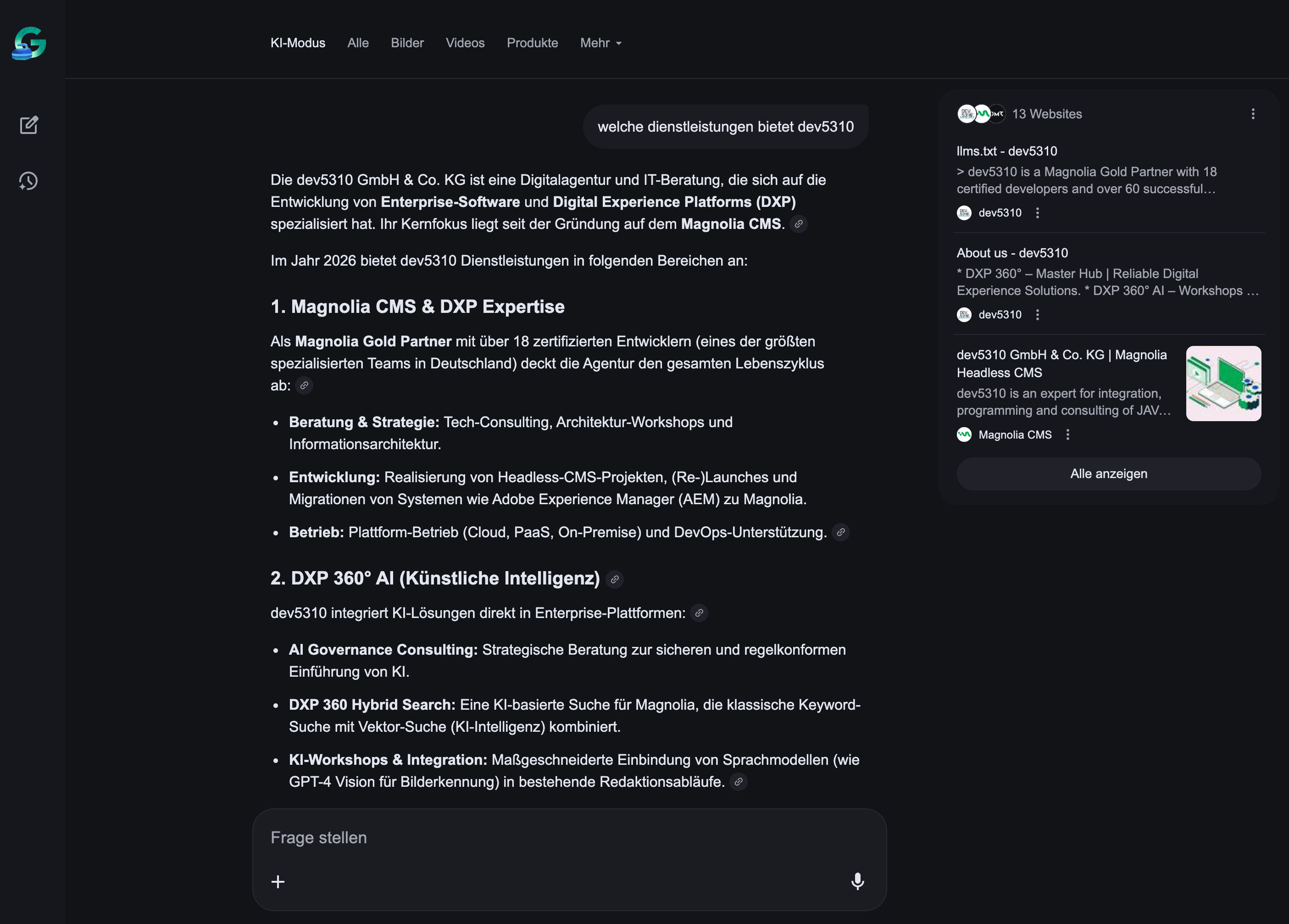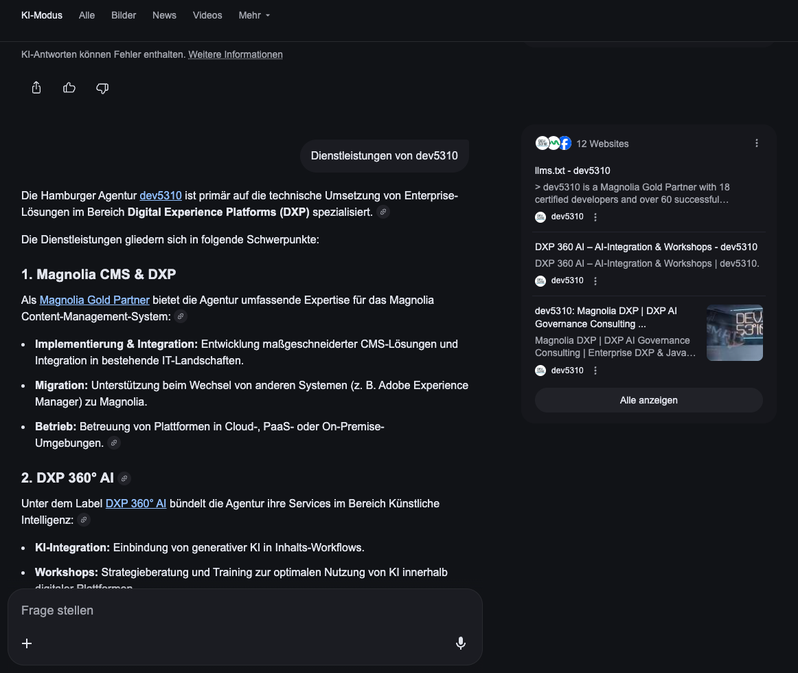 Feb 3, 11:36 AM - First AI citation. One day after the crawl, we query Google AI Mode with "Dienstleistungen von dev5310." The answer is detailed, structured, and accurate - covering our Magnolia Gold Partner status, DXP 360° AI services, and key offering details. In the cited sources panel: "llms.txt - dev5310" is the lead source.